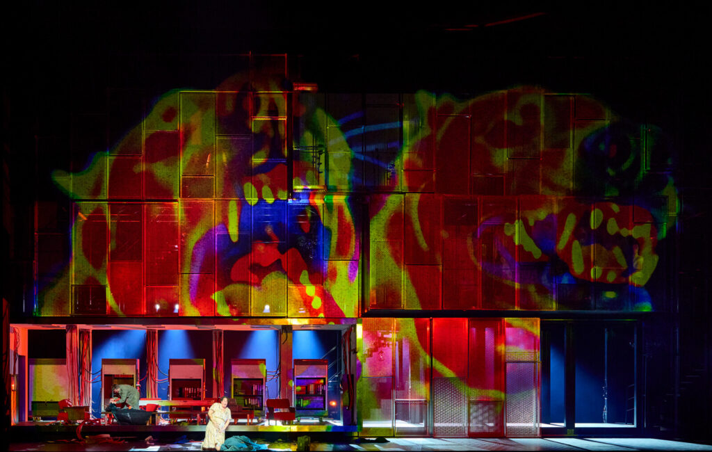 Le metteur en scène espagnol signe la première Tétralogie « transhumaniste », mais on comprend mieux la cohérence du propos développé pour cette Walkyrie. Cela se confirme dès le premier acte. Le décor est planté : un décor cauchemardesque de Tchernobyl moderne, où s’est produite l’apocalypse nucléaire. Seul un pauvre arbuste et une carcasse de bélier (sans doute un de ceux qui devaient tirer le char de Fricka ??) constituent les seules traces de nature. Le Walhalla ressemble à un vaste « data-center » sur lequel règne Wotan (en robe de chambre et bottes en caoutchouc), sorte de gourou de l’économie numérique, qui taquine sa fille avec un chien-robot E-doggy développé par la Société Ecotech. Les humains vivent confinés dans les espaces réduits du décor. « Décor » qui se résume en un immense mur de tôles perforées qui s’ouvrent pour apercevoir les compartiments dans lesquels se concentre l’action : d’abord la cabane de Hunding en uniforme nazi (avec bien sûr la petite moustache qui va avec) en train de dépecer le bélier et violenter son épouse Sieglinde (dont les multiples ecchymoses en témoignent) et en second plan, la salle « technologique » de Wotan, tout en haut le rocher de Brünnhilde.