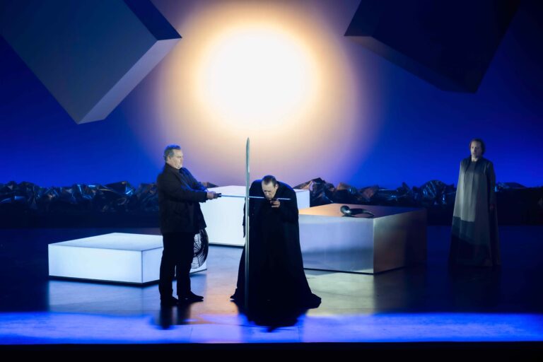 Après le Prologue, la transformation à vue des décors pour passer au palais de Gunther est particulièrement fluide, dans de belles lumières bleues. Des cubes et parallélépipèdes sont suspendus aux cintres, tandis que les lents mouvements des éléments au sol donneraient l’illusion qu’ils sont poussés sur roulettes. Les frère et sœur, Gunther et Gutrune, entretiennent une relation très forte, carrément incestueuse à vrai dire lorsqu’ils se donnent un baiser à pleine bouche… C’est ici qu’Hagen entre en jeu, personnage impressionnant, effrayant même, tout de noir vêtu et à l’apparence d’un prêtre en grand manteau qui célébrerait un mariage lorsqu’il fait agenouiller Gunther et Gutrune de part et d’autre de sa lance. Un bref moment décalé est toutefois à signaler, lorsque Siegfried lui demande de bien s’occuper du cheval Grane (Wohl hüte mit Grane…), Hagen sort de scène en galopant sur sa lance, un des rares instants d’humour de la soirée ! Gunther et Siegfried apparaissent plus tard côte-à-côte comme deux moines, coiffés tous deux de cônes au lieu d’un seul Tarnhelm, afin de ramener Brünnhilde au palais de Gunther.
