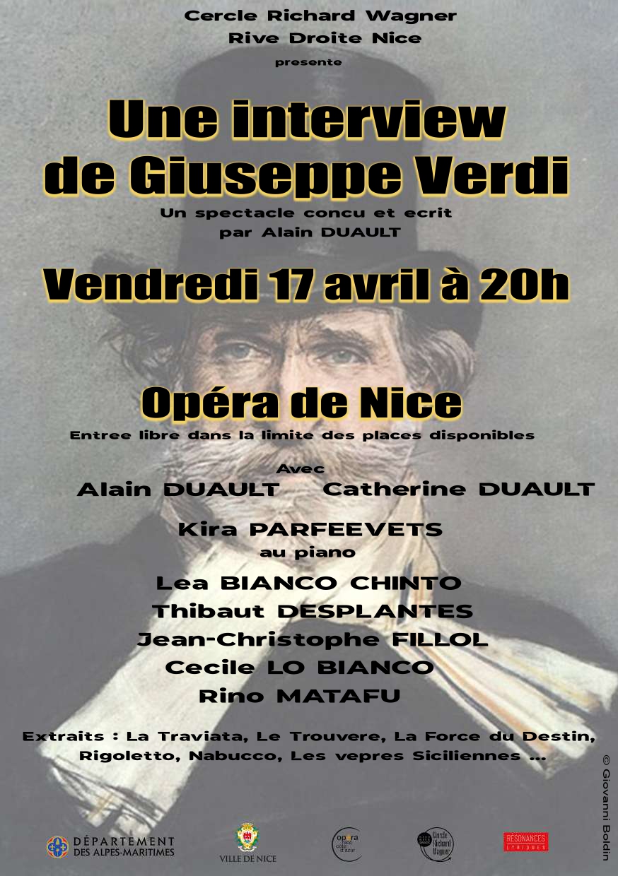 Tel fut le pari, pleinement réussi, du Cercle Richard Wagner Rive Droite Nice sous la houlette de son dynamique Président Yves Courmes en consacrant une séquence originale à Giuseppe Verdi, conçue en la la forme d’une « interview-concert » aussi érudite que théâtrale, sous les ors de l’Opéra de Nice.