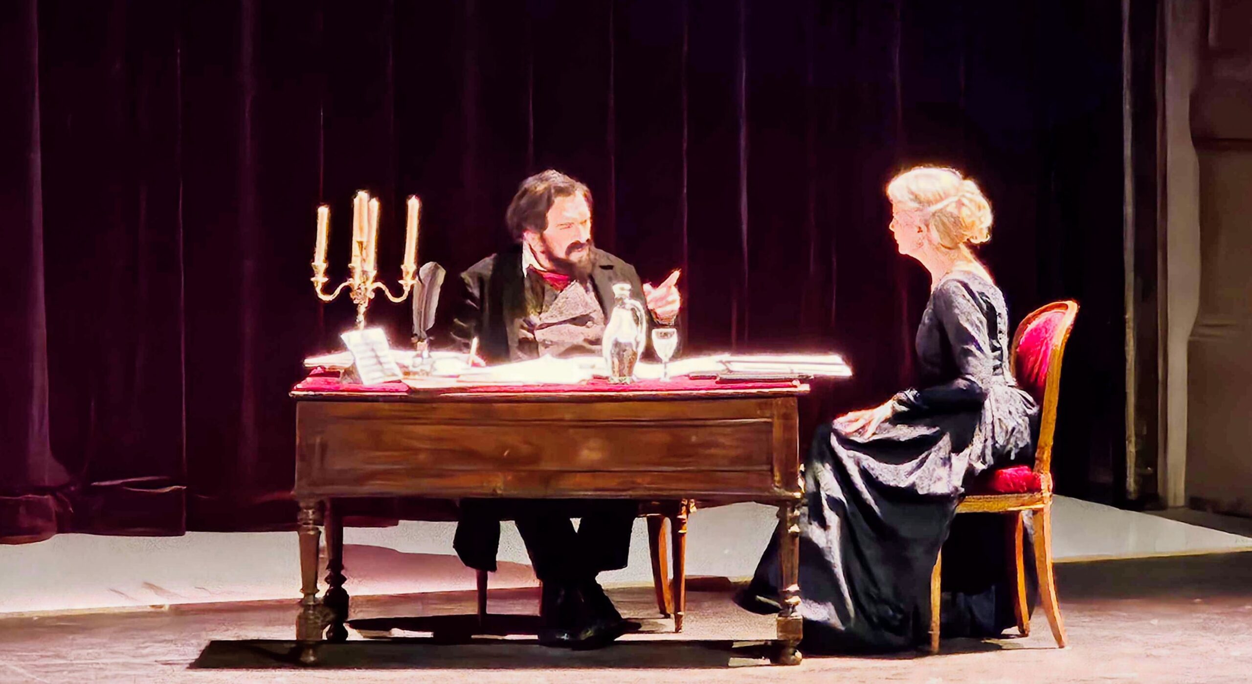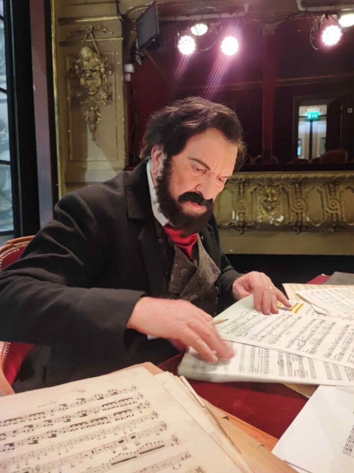 Le dispositif, d’une élégante simplicité, reposait sur une idée forte : faire parler Verdi lui-même. Ou plutôt le faire renaître le temps d’une soirée, assis à son bureau jonché de partitions, sous les traits d’Alain Duault. L’écrivain, homme de radio et de télévision, réalisateur et fin connaisseur du répertoire lyrique, avait endossé les traits et le costume du compositeur avec une justesse qui dépassait la simple imitation. Il ne s’agissait pas d’un jeu, mais d’une véritable incarnation, nourrie d’une connaissance intime de l’homme et de l’œuvre.